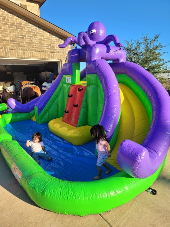 The monster octopus water slide includes a lot of fun and safety features with a sea creature theme. Kids can climb the center wall with its widened ramps and then race down two inflatable slides on either side of the octopus’s legs. The legs serve as bumpers to provide extra protection as kids slide into the pool. A water cannon sprays them as they slide down. This water slide can accommodate 6 children.
